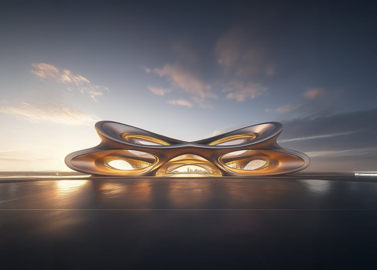 A fluid civic pavilion shaped by circulation, light gradients, and adaptive spatial flows.