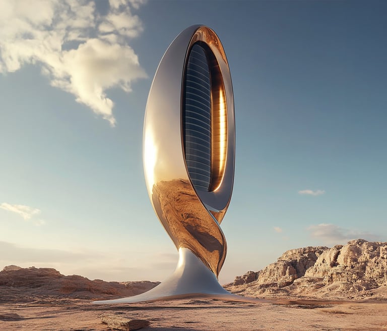 A vertical business landmark shaped by light, flow, and environmental logic.